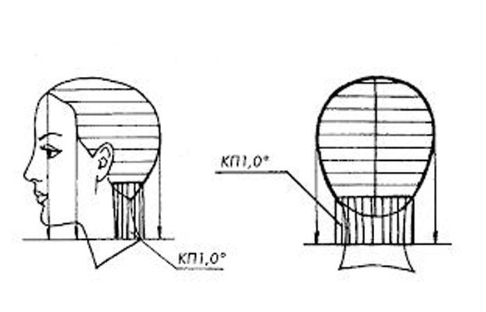 - Разделить затылочную часть горизонтальными проборами. Стричь каждый уровень по контрольной пряди, двигаясь снизу вверх.