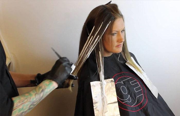 - Обработайте осветленную часть краской. Перемещайтесь по направлению роста локонов.