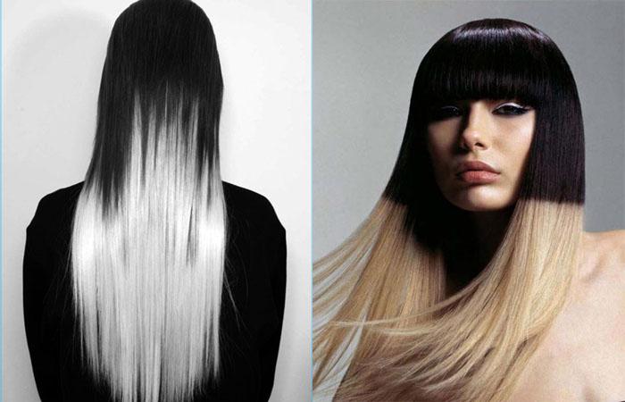 С четкой границей. В отличие от классической технологии, которая предполагает плавный, мягкий переход между тонами, здесь черта видна весьма отчетливо. Довольно часто используется при монохромном окрашивании, где задействованы черный и белый цвета (какой вверху, какой внизу — неважно, поскольку существуют оба варианта).