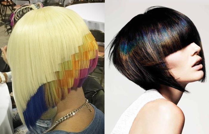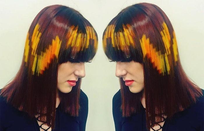 Модная техника необычного воздействия на волосы основана на покраске локонов слоями. Прическа создается при помощи нанесения на пряди определенного геометрического рисунка и использования своеобразного сочетания цветных локонов.