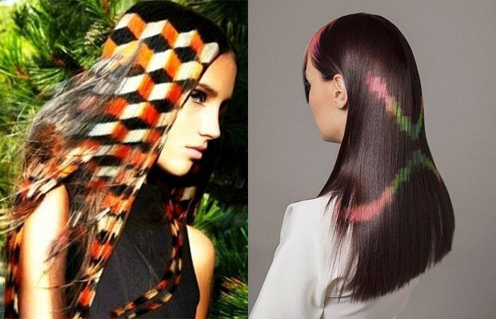 Креативное воздействие на пряди можно делать на любую длину волос. На коротких прическах эффектно смотрится выделение ассиметричных прядей или геометрический рисунок на затылочной части головы. На среднюю или длинную длину прядей стилисты наносят рисунок по прямым волосам в области плеч или лопаток.