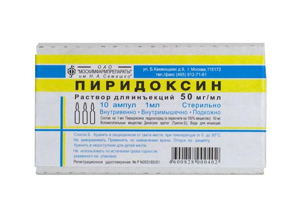 Также препарат выпускается в ампулах по 10 или 50 мг пиридоксина гидрохлорида, в качестве дополнительного компонента выступает вода для инъекций.