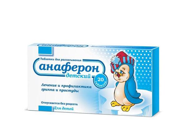 - Анаферон. Лекарство для детей назначается с месячного возраста. Таблетки рассасываются в полости рта в период между приёмами пищи. Стоимость 20 таблеток стартует с 240 рублей.
