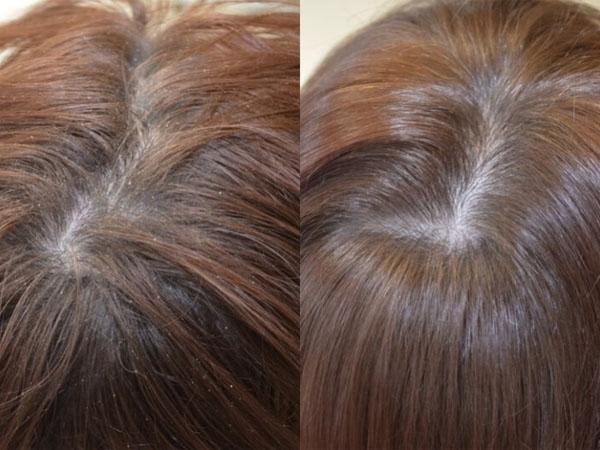 - Сделайте пробор, немного смеси нанесите на кожу головы, втирайте ее 2–3 минуты.