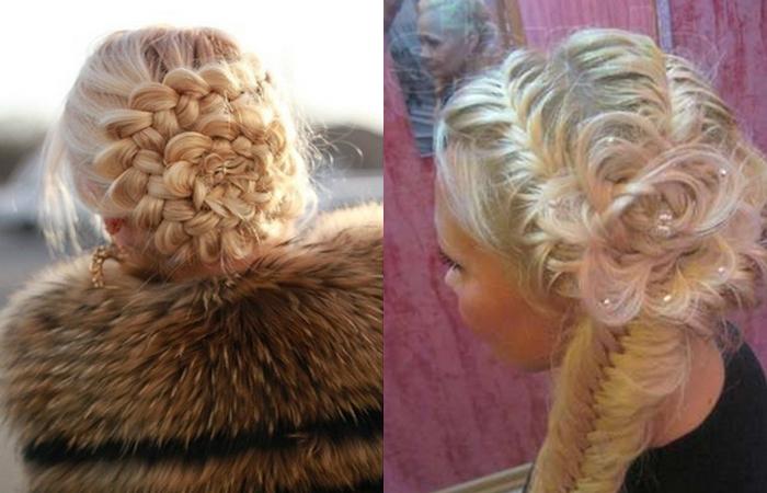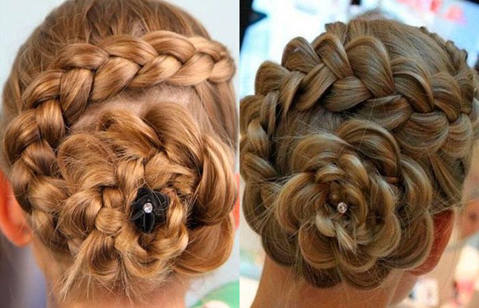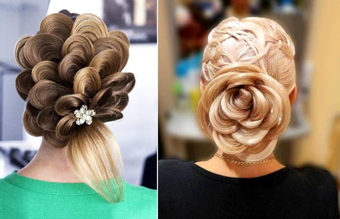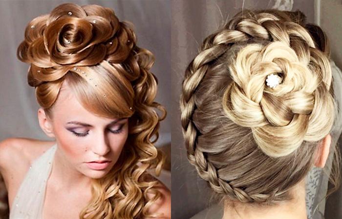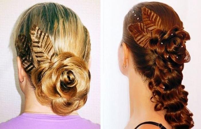 Сложные композиции создают из сочетания разных приемов. Цветок делают из кос, свободных прядей. Розу дополняют завитыми локонами, прядками гофре. Конструкцию часто украшают бижутерией. Броские аксессуары помогут акцентировать внимание.
