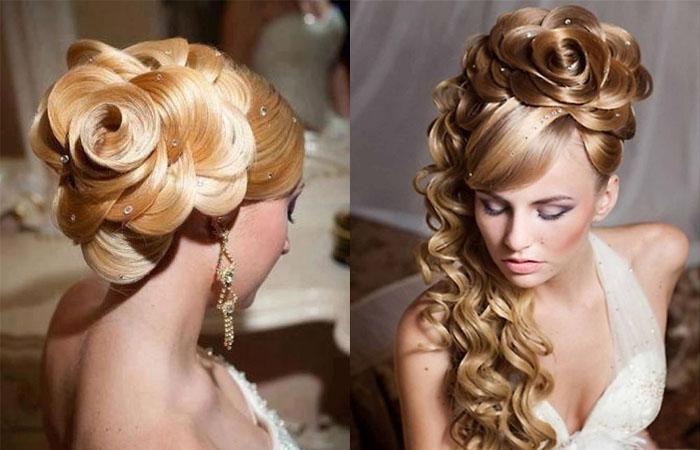 Прическу с цветами из волос выполняют для шевелюры любой структуры. Укладка не исключает присутствие челки. В зависимости от задумки мастера, розы выполняются разного размера, текстуры. Укладка отдельно выглядит празднично, но может дополнительно украшаться бижутерией.