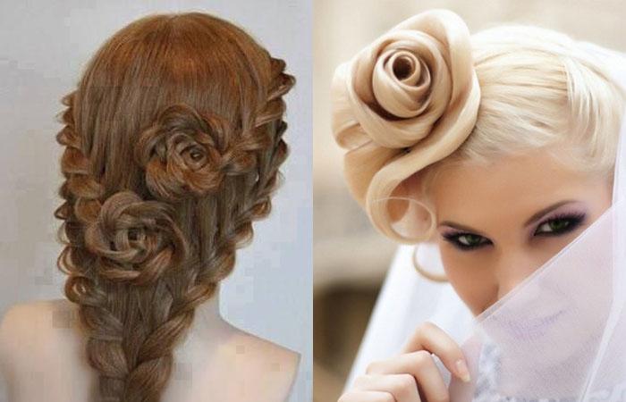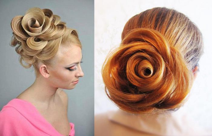 Прическа роза всегда впечатляет красотой. Укладка представляет собой цветок из волос, скрученный из прядей, выступающих лепестками. Элемент размещают в любой части шевелюры. Роза выступает частью сложной композиции, способна играть роль акцента.