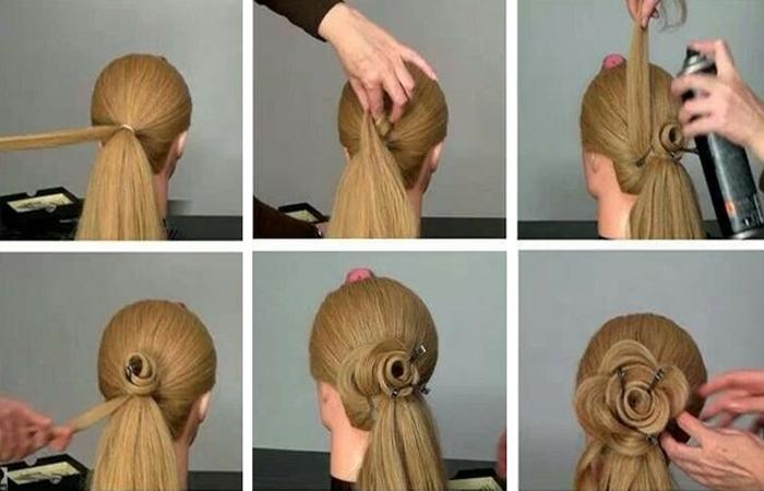 Для работы понадобятся: резинки, шпильки, невидимки, заколки, расческа, лак. Манипуляция займет не более 15 минут времени. Классическую розу выполняют по следующей технологии: