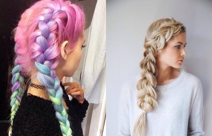 Колосок с канекалоном на пике популярности, яркие искусственные пряди объемных кос заполонили городские улицы. Выполняется прическа на средних локонах, накладные косы удлиняют волосы, придают густоту редким прядкам. Укладка сохраняет аккуратный вид на протяжении недели. Фиксируются резинками, для запаивания кончика канекалона достаточно опустить срез в кипяток. Искусственные локоны вплетаются в натуральные волосы как ленты, поэтапно повторяется схема обратной косы. Материал не утяжеляет и не вредит стволовой структуре. Подходят радужные косы для создания стильных образов молодым и креативным.