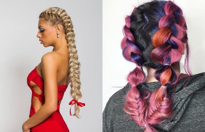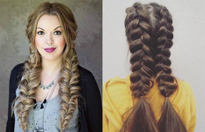 «Рыбий хвост» — плетение состоит из двух прядок. Хвосты разделяются пополам и по тонким локонам добавляются поочередно к центру. Чем тоньше прядки, тем интереснее выглядит прическа, плести так же просто, как и трехлучевую косу. Подходит для романтических, женственных образов, выполняется на прямых и пышных, вьющихся локонах. Креативный вариант плетения из калачиков требует предварительно сделать из прядей жгуты, лишь после соединить в косу.