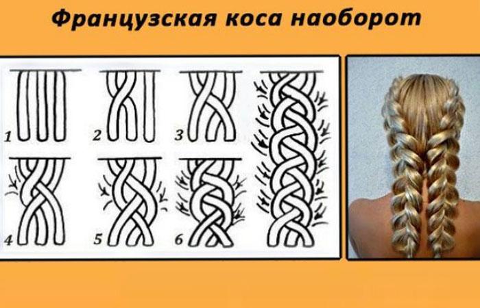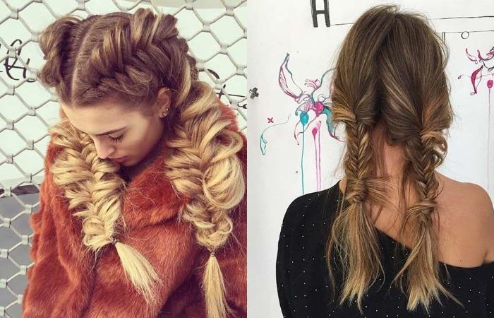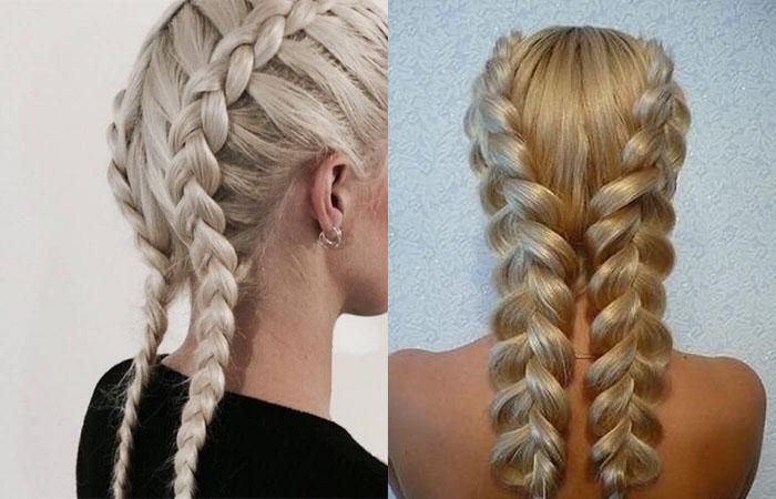 Французские косы или колоски на выворот плетутся как классические, но боковые пряди накладываются не на центральный локон, а проходят под ним. Техника позволяет создать пышные плетения в сочетании с контрастной гладкой головой. Выполняется прическа на средних и длинных локонах, прямой, волнистой структуры. Подходит для девушек с безупречными внешними данными, симметрия укладки акцентирует внимание на недостатках. Кому подходит прическа две французские косички, стильные варианты укладки, вы найдете на нашем сайте.