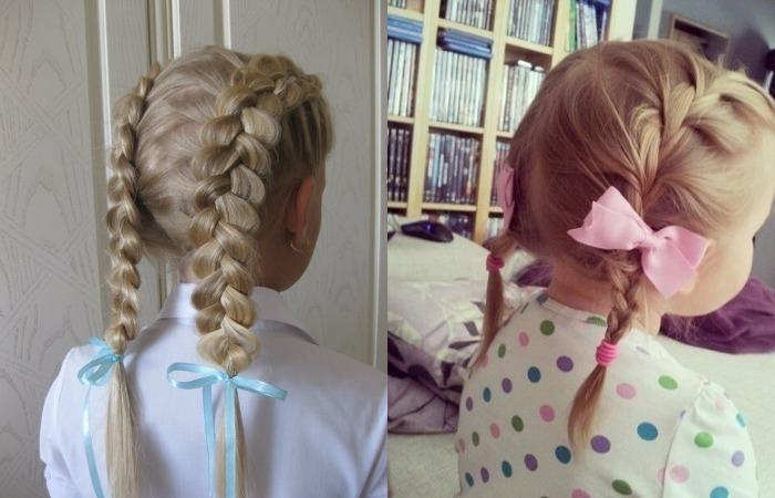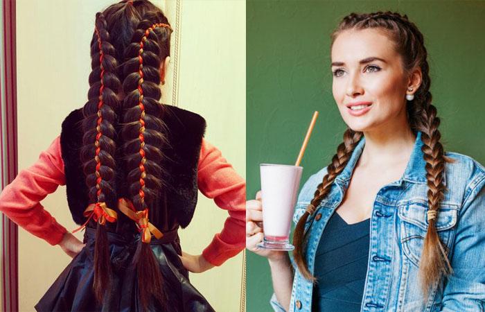 Универсальную укладку можно подобрать для разных типажей внешности. Любимые 2 косички завязывают маленьким принцессам, традиционно используется и для школьных будней. Искусно обыгранная аксессуарами украсит и зрелых женщин.