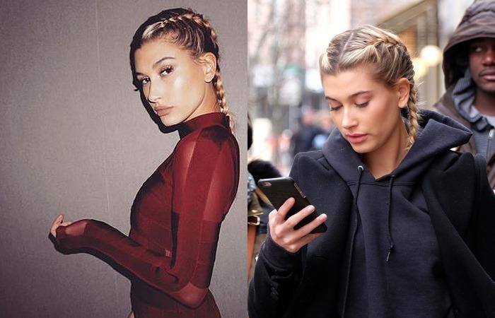 Хейли Болдуин заплетает небрежные колоски на среднюю длину.