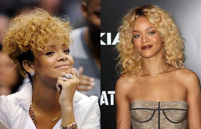 Рианна часто экспериментирует с укладками на разной длине. Мелкие кудряшки подчеркивают яркую внешность исполнительницы.
