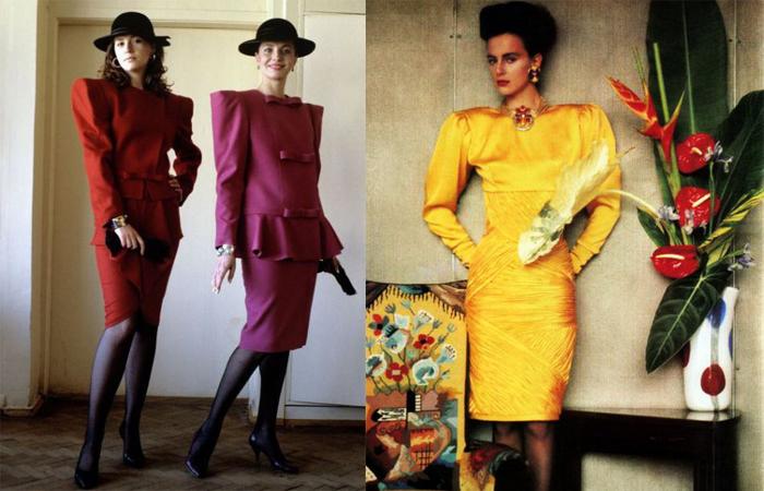 Активно формируется деловой стиль, актуален силуэт с широкими массивными плечами и узкими бедрами. Для достижения желаемых пропорций блузы, костюмы, кардиганы, верхнюю одежду дополняли накладными подплечниками. Использовали а-ля мужской силуэт модницы всех типажей внешности, не учитывая гармонию пропорций. Массовая истерия обезличивала моду, все носили одинаковые изделия, но в разной цветовой гамме. Обзор причесок в деловом стиле своими руками вы можете просмотреть на нашем сайте.