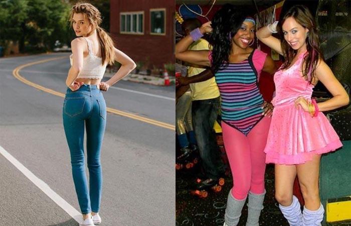 В женском гардеробе появляются джинсы варенки, лосины неоновых цветов, туники «Летучая мышь», футболки больших размеров с логотипами компаний или мультяшными персонажами. Особый трепет вызывают бренды, лейбы с внутренней стороны вырезали и пришивали к лицевой. Безумие чрезмерности достигало не виданных масштабов. Барышни надевали все лучшее, яркое, блестящее сразу, объемный верх, широкий пояс, узкие джинсы или мини-юбка — подобные образы использовали вне зависимости от повода и времени дня.