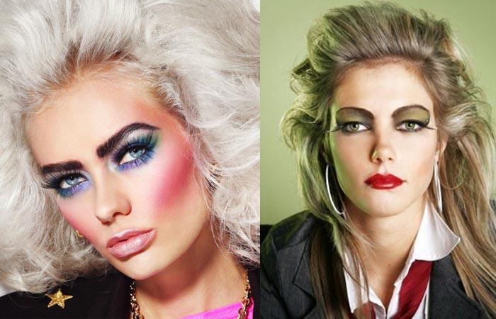 В макияже отсутствовали все правила, основной целью было накрасить лицо, а не подчеркнуть внешнюю красоту. Модницы буквально наносили слоями декоративную косметику, не учитывая сочетание холодных и теплых оттенков, цветотипа внешности. Яркими красками выделялись глаза, губы, скулы. На веки наносили до самой линии бровей кричащие синие, зеленые, бордовые тени.
