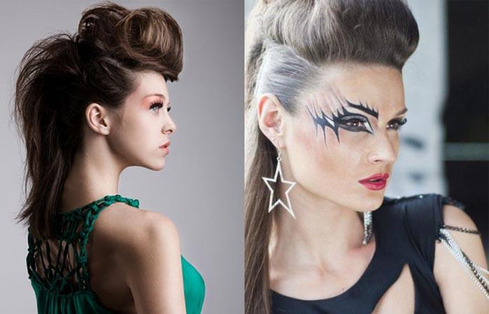 Рокерские стрижки выполняются на короткой и средней длине. Можно использовать выбритые элементы, современные техники окрашивания. Для желающих лишь на время изменить образ, рекомендуется создать высокий начес на темени до макушки. Укладки могут выполнять смелые, креативные барышни, желающие привлечь к себе внимание. Подобные модели украсят правильные, треугольные овалы, сочетаются с ярким макияжем, стильными металлическими аксессуарами.