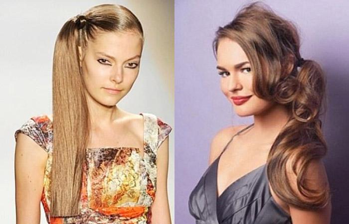- Хвост на боку. Вариант смотрится оригинально. Асимметрия прекрасно справляется с задачей коррекции недостатков. Можно сделать гладкий или пышный хвост. От пары элементов по бокам лучше отказаться. Вариант на дискотеке смотрится двусмысленно, пошло.