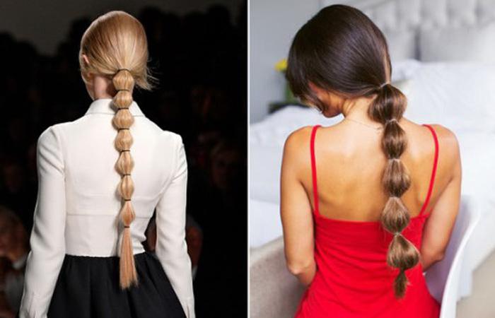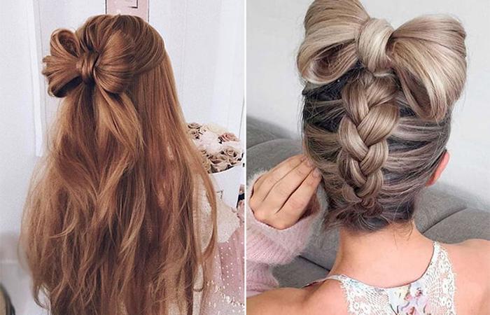 - «Бантик» из волос. Элемент выглядит кокетливо. Убирают полный объем волос или украшают бантиком распущенную (убранную) шевелюру. Прическу сделать очень легко. Волосы просто сворачивают в петлю, которую делят пополам, дольки разводят по сторонам.