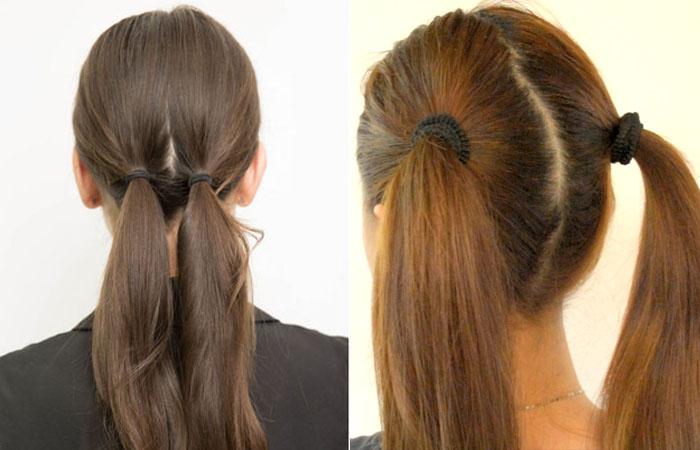Выполняется на разную длину, на коротких прядках, завязанных на теменной области, выглядит как ушки. На средних и длинных, можно создать несколько вариантов. Хвосты располагаются симметрично по бокам, на макушке, затылке. Интересно смотрятся сочетания гладких прядок на голове и пушистых, объемных кончиков. Вьющиеся, кудрявые локоны требуют большего терпения, для средней, длины ниже плеч, подходят сочетания двух колосков, переходящие в хвосты. Для прямых, тонких волос стоит выбирать мягкие резинки, иначе легко повредить хрупкую структуру.