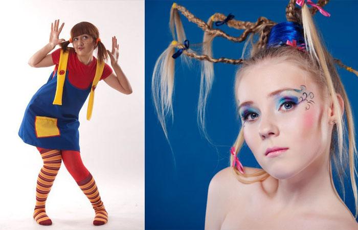 Асимметричные хвосты, в стиле пеппи длинный чулок, прикольная озорная укладка, создает игривое, веселое настроение. Подходит стройным, юным девушкам, с гармоничными чертами лица. Прическа создается на коротких волосах, а также ниспадающих длинных локонах. Лучше смотрится с короткой прямой челкой.