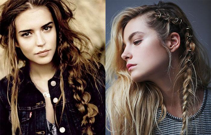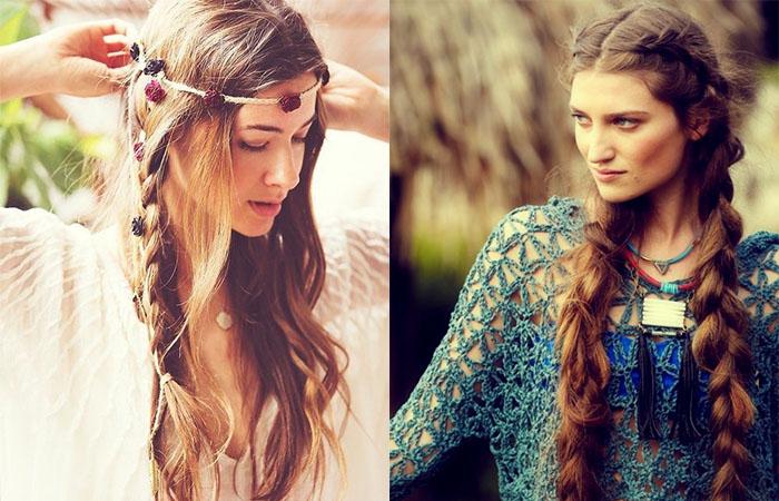 Волосы оставляют в естественном виде: не выпрямляют и не завивают. Наиболее часто встречается вариант прически: шевелюру разделяют вертикальным пробором, от темени назад или по лбу пускают тонкие косички. Плетение нередко заменяют сложенным в полоску платком, лентой, шнуром или венком из цветов. Для женщин с длинными волосами не менее популярной выступает свободная коса от затылка, пущенная назад или на 1 бок. Верхняя часть прически нарочно рыхлая, растрепанная. Аналогично допустимо сделать 2 косы по бокам или несколько маленьких плетений на фоне распущенного полотна.