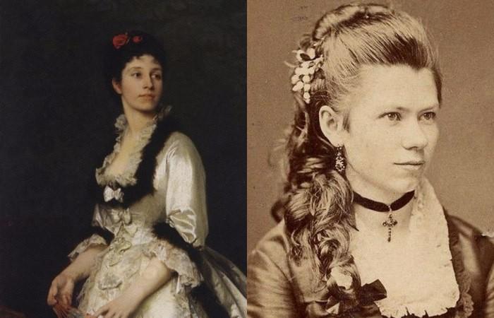 Модели 1870 по 1880 год отличались сочетанием собранных у лица локонов и ниспадающих прядок на затылке. Европейские прически подчеркивали замысловатые шляпки, мода на которые активно развивалась. Украшались брошами, лентами, перьями, диадемами. Выделяли красивую линию тонкой лебединой шеи, идеалы красоты 80 х годов актуальны и сегодня.