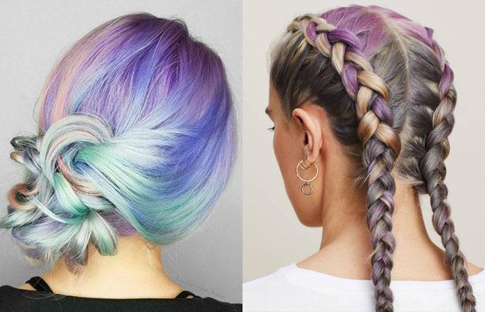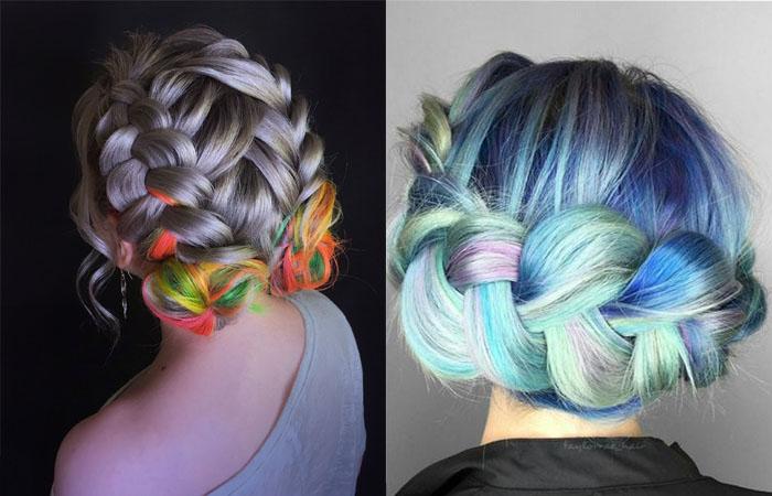 Сочетание модного окрашивания и плетений отвлекает от проблемы грязных волос. Для создания яркого креативного образа, можно воспользоваться оттеночными мелками или спреями. Краска хорошо ложится на прядки, маскируя жирный блеск.