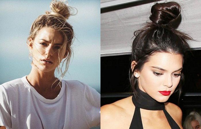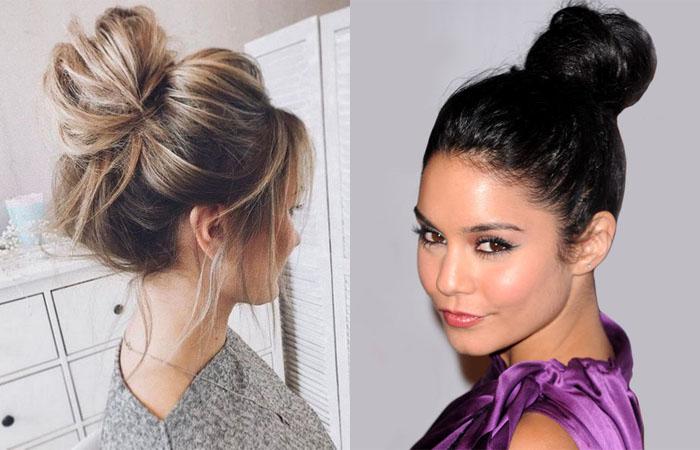 Пучок выполняется на среднюю, длину ниже плеч. Копна собирается и фиксируется заколками, резинками. Отсутствие макияжа, аксессуаров создают домашний образ. Укладка может стать украшением вечернего выхода, максимально открывает лицо, подчеркивает линию шеи.
