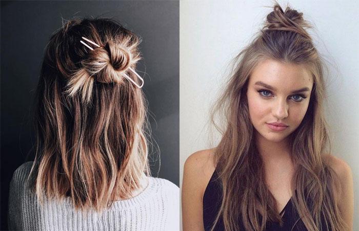 Можно завязать частичный пучок, собрав волосы теменной, височной области. Прическа выглядит креативно, особенно с оригинальной заколкой, гармонична с различными стилистическими направлениями. Как делается прическа «Хан», кому подходит, вы можете подробно ознакомиться у нас на сайте.