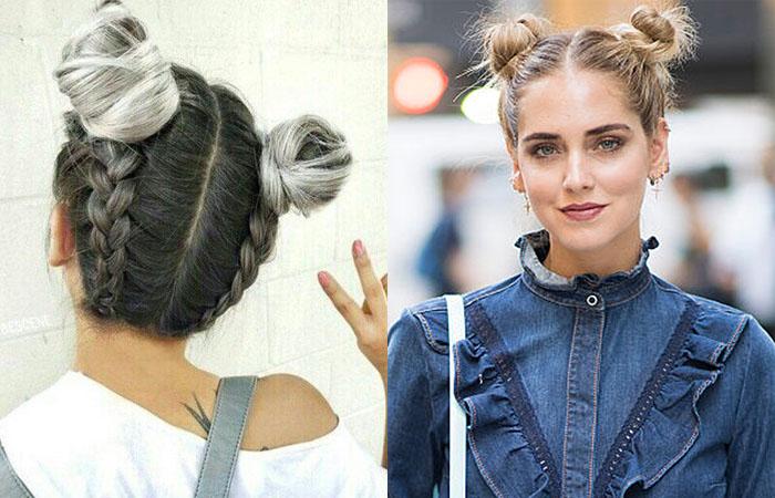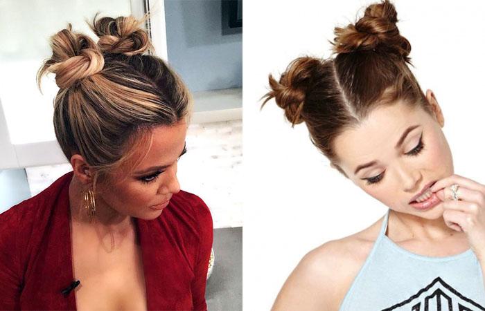Два симметричных пучка подходят для юных девушек. Игривая прическа очень просто создается, легко скрывает несвежие волосы. Выполняется как на прямых, так и на вьющихся волосах.
