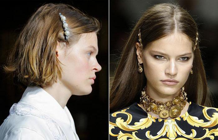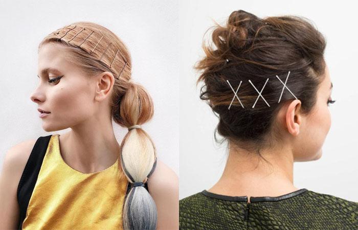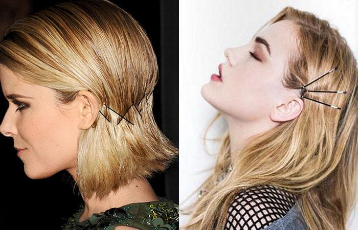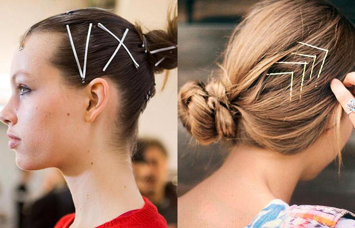Последним трендом являются укладки, декорированные обычными невидимками. Оригинальная прическа подходит для вечерних образов, а также гранж направлений.