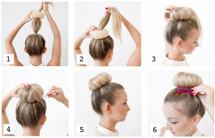 Для выполнения укладки вам потребуются 2 резинки, невидимки для фиксации и валик для пучка. Соберите пряди в высокий хвост, наденьте валик, расправьте волосы равномерно по кругу и зафиксируйте их второй резинкой. Ниспадающие концы уложите вокруг пучка, закрепите невидимками.