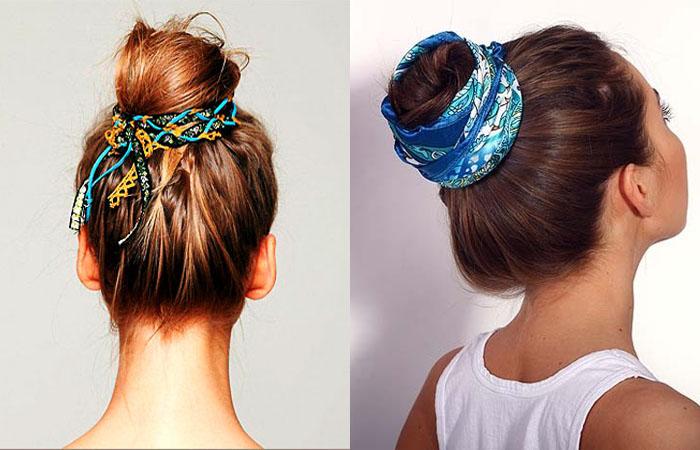 - Не успели приобрести подходящий аксессуар — используйте легкий платок. Скрутите ткань в жгут в несколько сложений и вплетите в косу, обвяжите пучок или хвост. Такой вариант укладки раскроет вас перед окружающими как стильную, творческую личность, подчеркнет смелость, напористость характера.