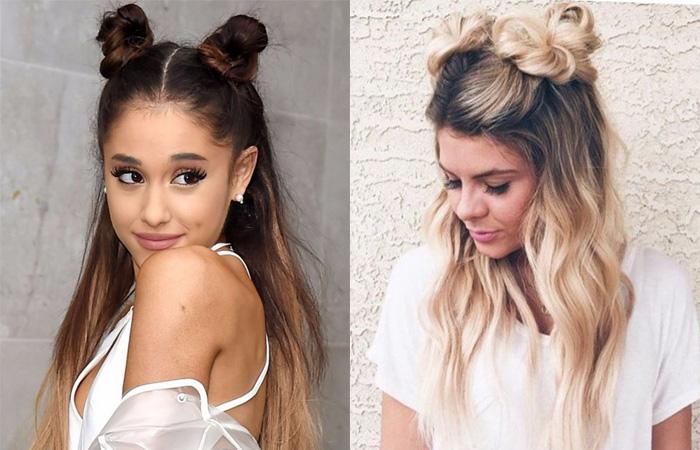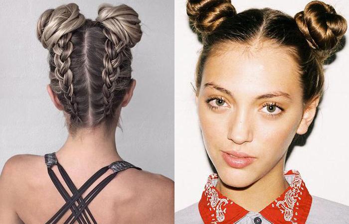 Юным, дерзким модницам можно выполнить два небольших пучка. Такая прическа идеально сочетается как с короткими шортами, выпущенной широкой блузой, так и с легким платьем в стиле «Бохо».