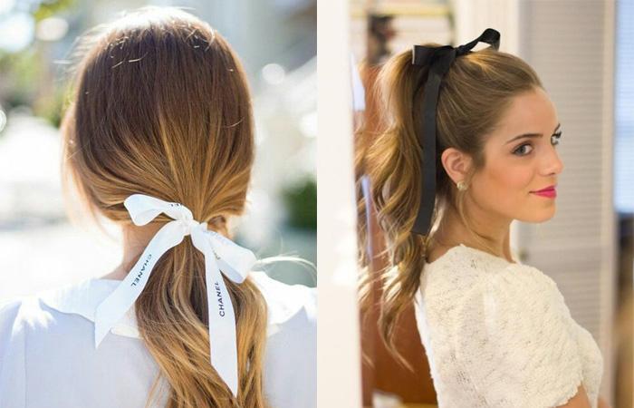 - Хвост с лентами. Такой аксессуар, как ленты идеально дополняет наряд, если выбран в тон к нему. Даже обычный низкий хвост, завязанный лентой, смотрится более элегантно, изысканно.