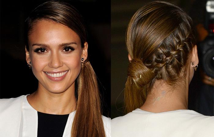 - Хвост с плетением (косами). Для выполнения такой укладки, нужно заблаговременно выделить прядь, заплести из нее косу, после чего собрать волосы в хвост. Обратите внимание, вы можете постоянно экспериментировать с типом плетения, его расположением, придавая образу неповторимости.