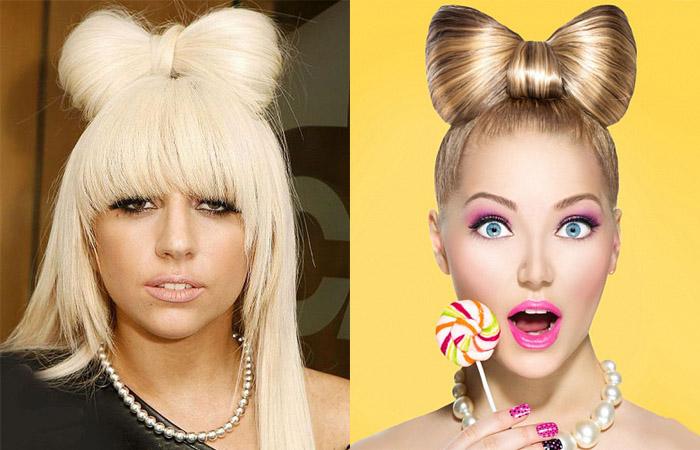 - Бант из собственных волос относится к свежим модным тенденциям, легко выполняется и выглядит потрясающе. Нередко этим приемом пользуются известные поп-дивы Пэрис Хилтон и Леди Гага.