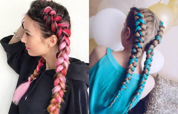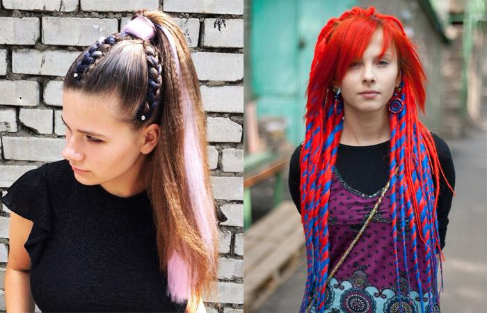 Цветные прядки просто вплетают в шевелюру, но даже две обычные симметричные косички с канекалоном смотрятся совсем по-другому. Будьте уверены, вы не останетесь без внимания посторонних. Оттенков дополнительных прядей множество, плюс можно экспериментировать, смешивая различные цвета.