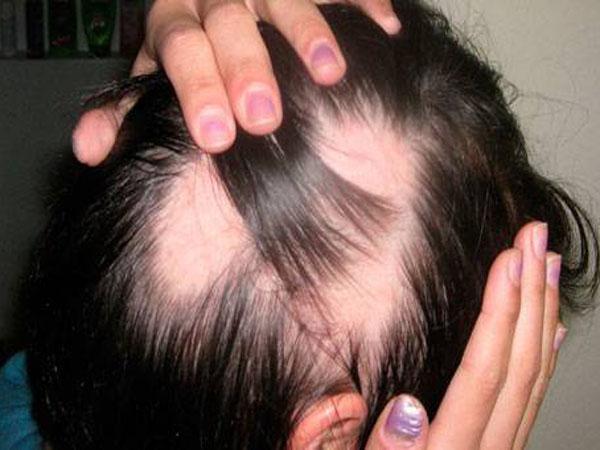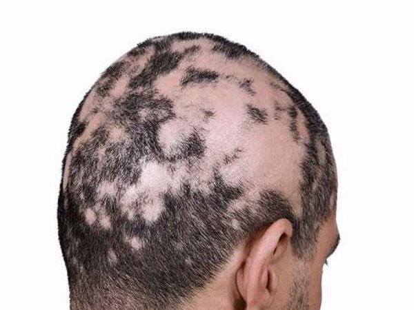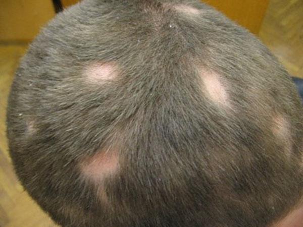 - Мелкоочаговая алопеция начинается с затылочной и височной областей, очаги размером с одну-две монетки, неправильной формы. Волосы выпадают неполностью, однако это может затронуть не только голову, но и другие волосистые участки — брови, усы, нательные волосы.