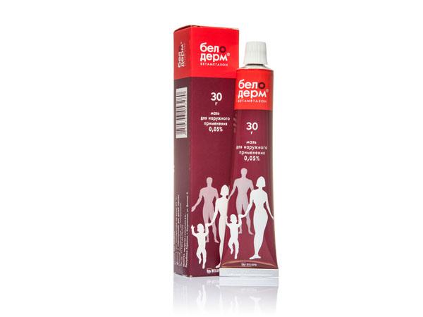 - Белодерм. Кортикостероидный препарат с антипролиферативным и антигистаминным эффектом. Сужает сосуды, избавляет от приносящих дискомфорт симптомов сифилитической алопеции, других кожных заболеваний. Без побочных эффектов. Цена 270–300 р.