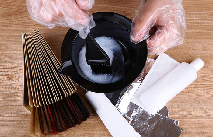 - Смешайте все компоненты красителя. Для того чтобы локоны не стали ломкими и неживыми, не следует мыть голову перед процедурой.