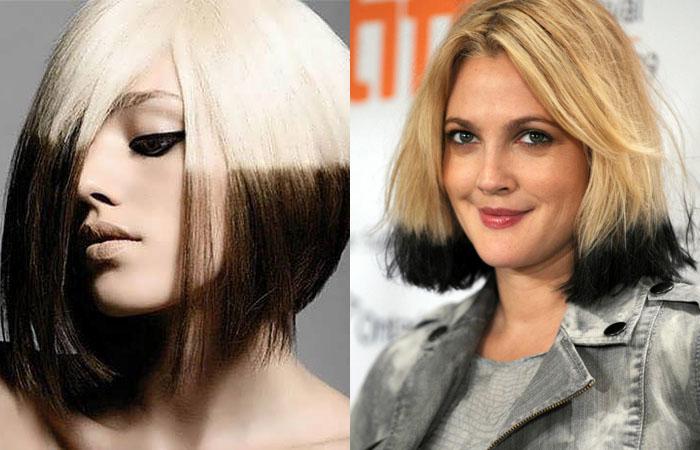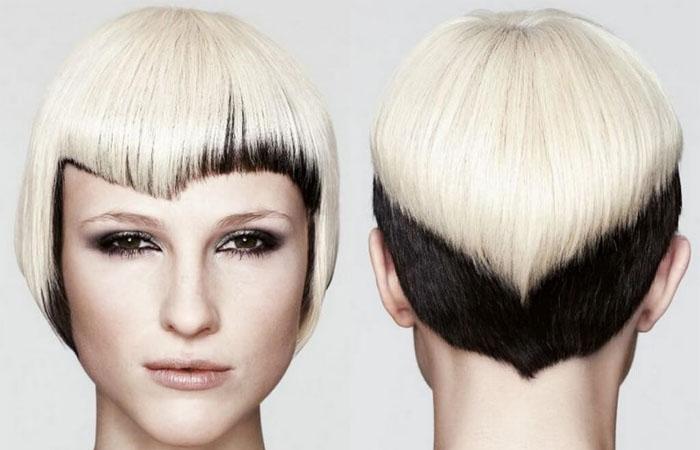 С чёткой границей. Этот вариант причёски предполагает отсутствие плавного перехода цвета. Мастер отделяет локоны так, чтобы был виден чёткий контур между 2-я тонами.