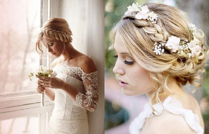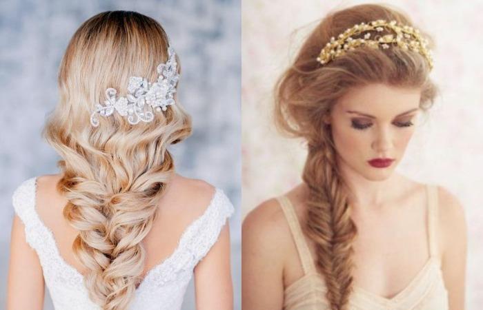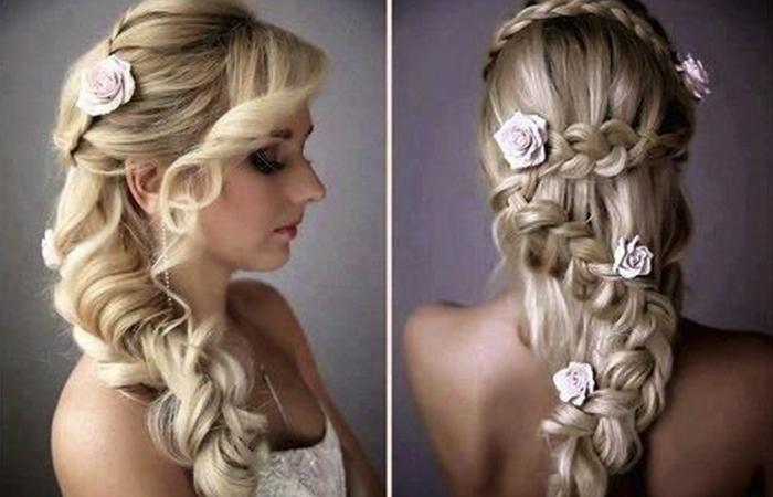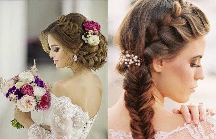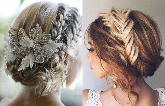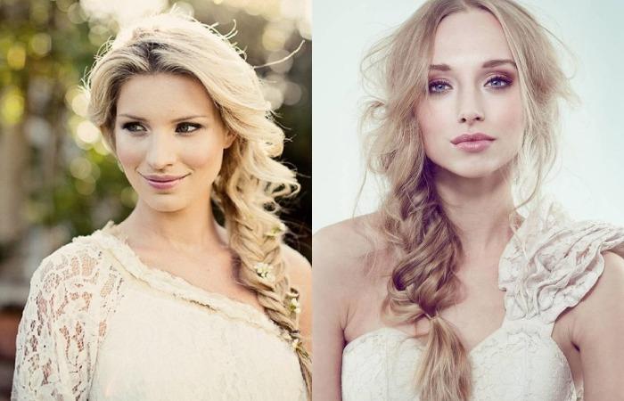 Собранные локоны придают элегантность, прическа из косичек может располагаться вокруг головы. Длинные волосы, заплетенные в колоски, подходят для классических образов. Но благодаря современным трендам, допускается небрежность выполнения. Выбившиеся из общей копны прядки придают прическе легкость, пышность. Также укладка корректирует форму лица, можно использовать не только невестам с идеальным овалом. Круглолицым барышням также подходит укладка, благодаря удлиненным локонам у лица легко выглядеть в этот день богиней.