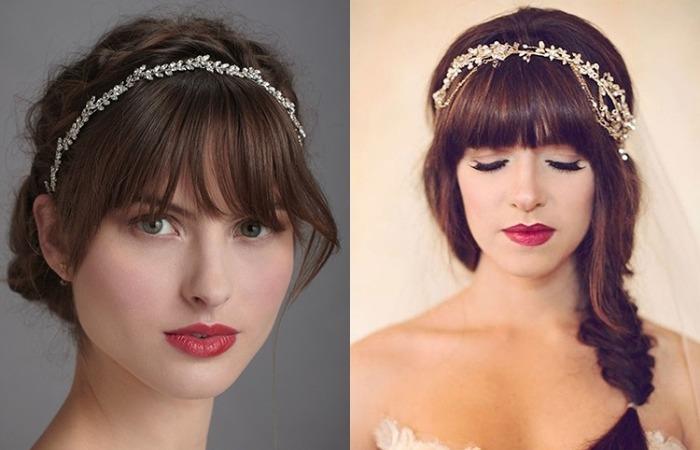 Удлиненная челка — оптимальный вариант для свадебных причесок. Резкие углы прямой или косой не подходят образу невесты. Сочетается с косой-ободком, подходит и для асимметричного плетения. Для тожества рекомендуется выбрать красивый декор. Тонкие обручи с камнями, цепочками, жемчужинами, превращают простые укладки в праздничные.