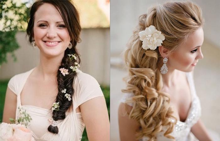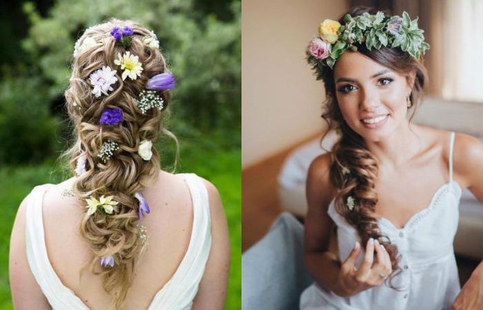 Цветы часто используются в свадебных прическах. В косички вплетаются преимущественно бутоны, присутствующие в букете. Для украшения не обязательно используются лишь белые, кремовые, персиковые и розовые цветы. Современные невесты выбирают яркие композиции, подходят для платьев в стиле ампир, а также винтажных нарядов.
