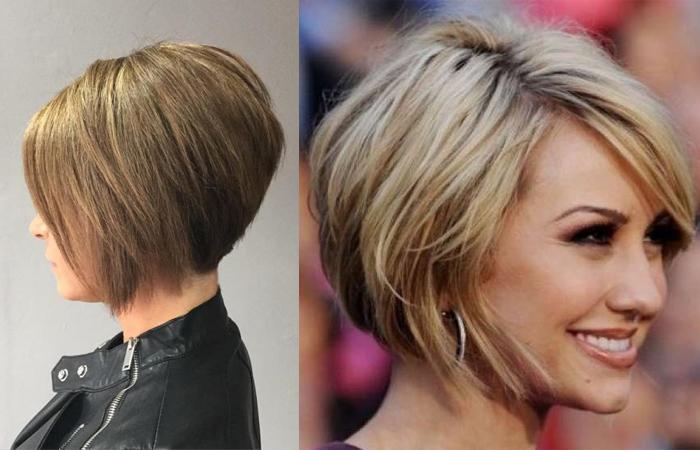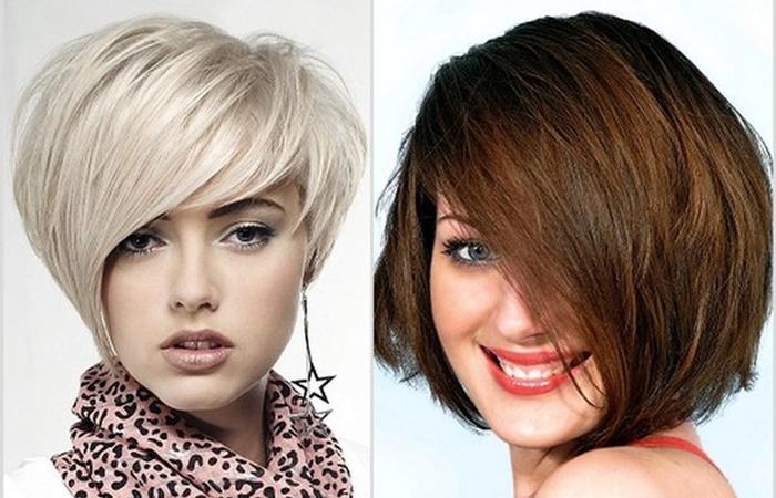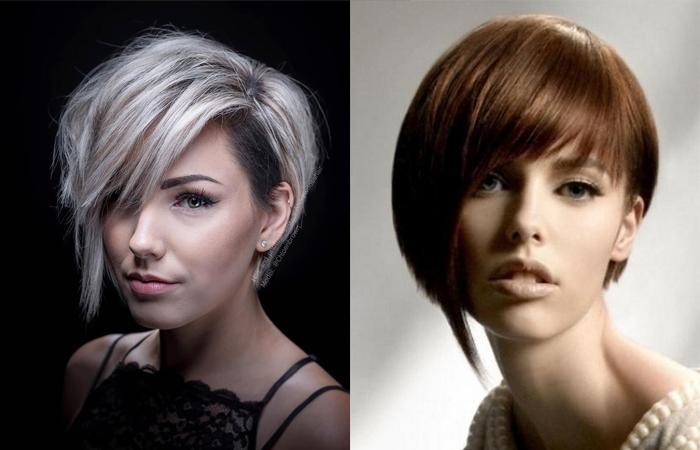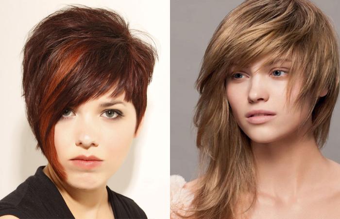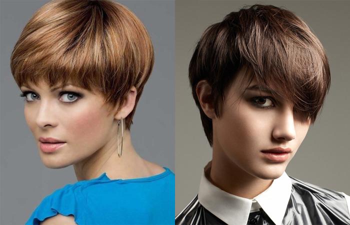 - на коротких прядях основной объем сосредоточен в области затылка и макушки, локоны у висков могут быть срезаны под углом, рваные срезы у лица придают легкую небрежность, облегчают последующее укладывание, выполняется преимущественно с косой челкой, угол наклона совпадает с основной формой;