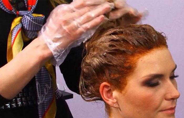 - На сухие чистые прядки наносится подготовленный состав, который нужно распределить по волосам равномерно. Если окрашивание происходит повторно, средство наносится сначала на корни, а затем — на всю длину локонов. Интервалы между нанесениями указываются в инструкции. Как правило, средняя длительность безаммиачного окрашивания составляет 30–40 минут.