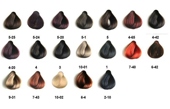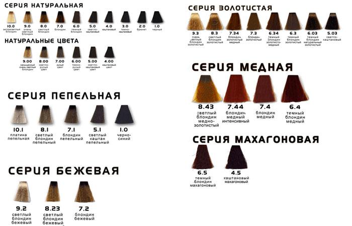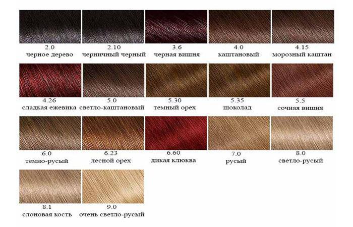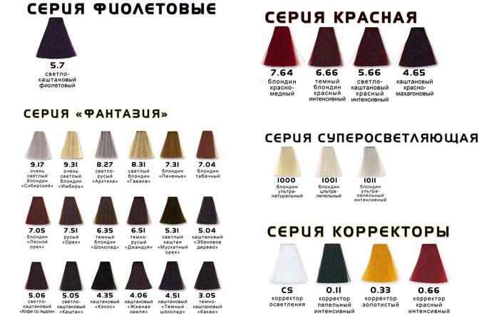 Что касается цветовой палитры, то представлена она, в основном, темными оттенками: коричневыми, шоколадными, темными русыми и прочее. Присутствуют здесь и 6 оттенков блондина, а также светло-русые цвета. Есть, также, оранжевый, сиреневый и цвет красного золота. Стоит такая краска в пределах 460 рублей.